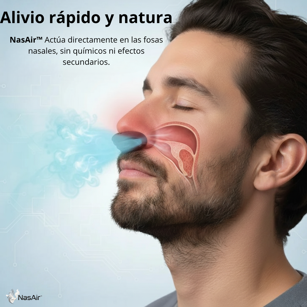 NasAir™ actúa directamente en las vías nasales, ayudando a aliviar la incomodidad y facilitar la respiración en pocos minutos, de forma natural y sin productos químicos ni efectos secundarios.